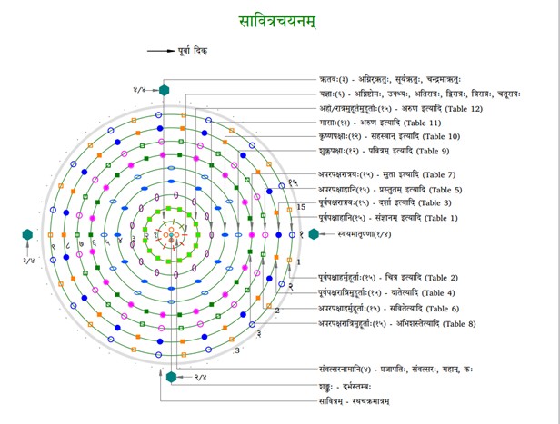 Time-units like muhūrta-muhūrta [3.2 minutes], muhurta [48 minutes duration], day, night, fortnight, month, season and year etc. reckoned due to the traversal of Sun are represented by small bricks/stones [golden pieces or pebbles the size of the top [one-third] section of a finger, smeared with ghee - in all 185 in number]. They are arranged as per Śrautasūtra prescriptions in nine concentric circular spaces, and in the hub portion, Āhavanīya agni is kept. This verily may be called kāla-cakra [wheel of time]. A Diagram depicting this is included here.